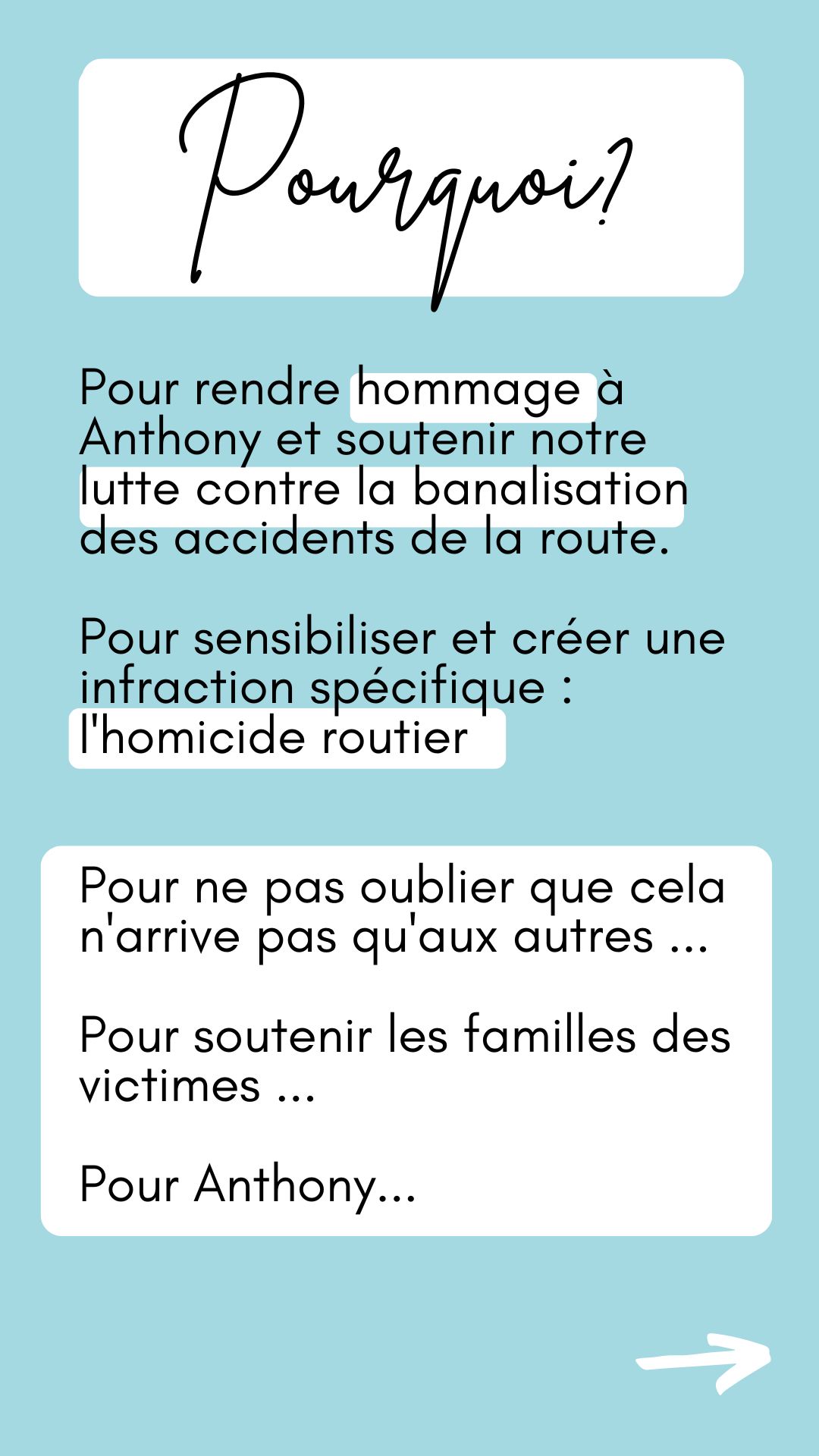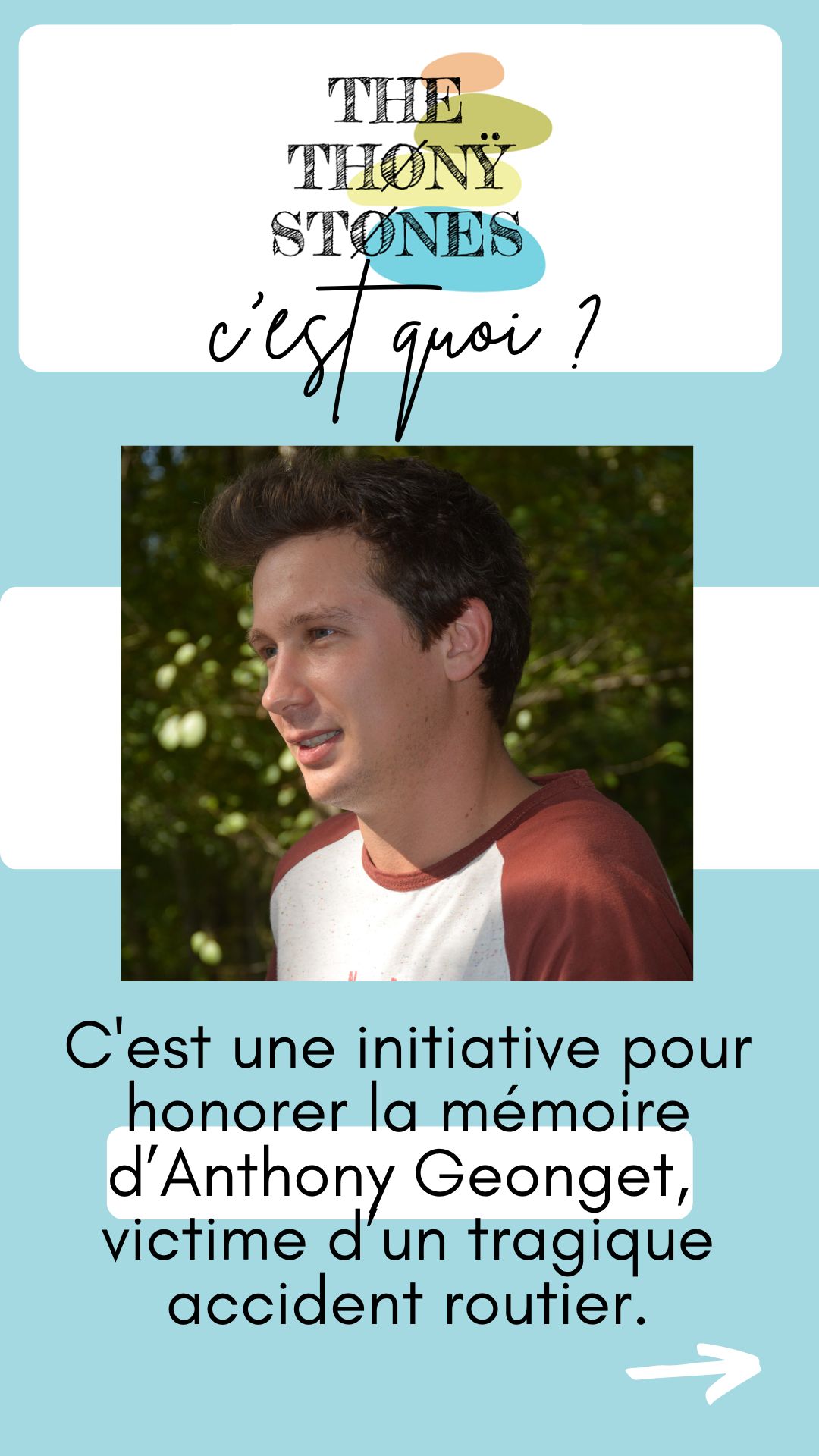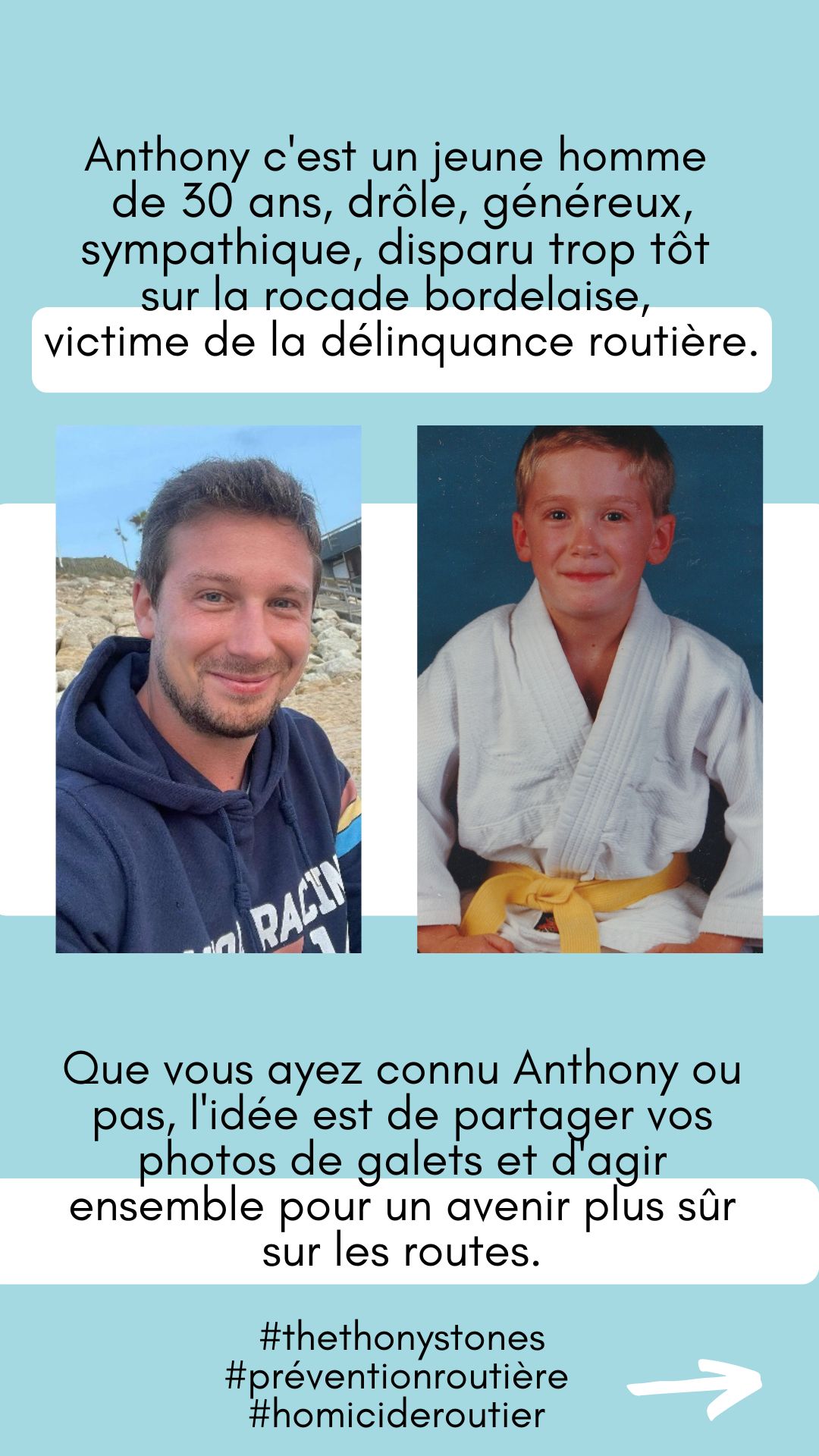 C'est l'histoire d'Anthony, jeune homme de 30 ans, drôle, généreux, sympathique, aimant et aimés de tous, trop tôt disparu sur la rocade bordelaise, victime de la délinquance routière.
